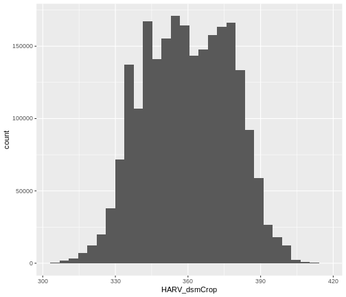 geom_histogram(data = dsm_harv_df, aes(HARV_dsmCrop))